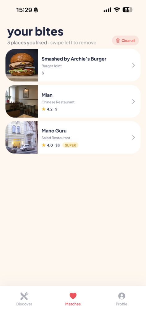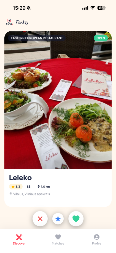 Photos, ratings, distance, hours. Tinder-style cards for restaurants in your radius.